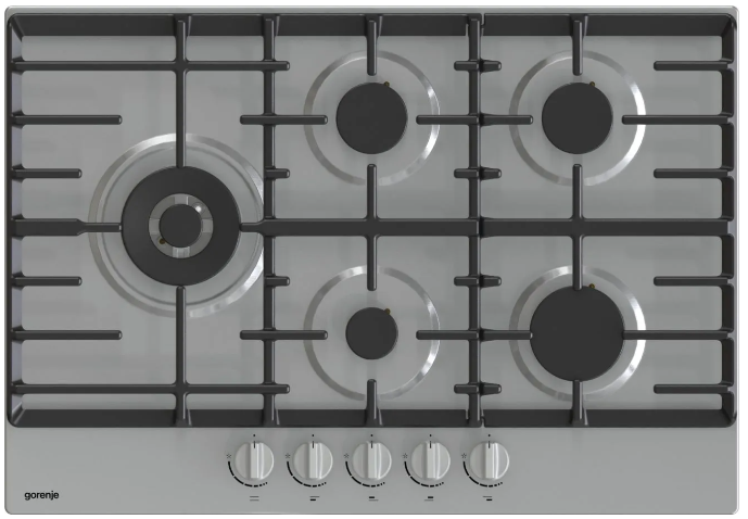 Gas hob, 75 cm, stainless steel, 5 burners, front control, high qualified burners, one-hand ignition, wok burner, full safety.