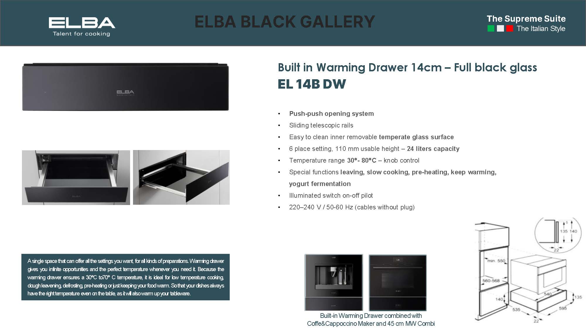 Warming drawer 6 place setting, 110 mm usable height – 24 liters capacity, slow cooking, pre-heating, keep warming, yogurt fermentation.