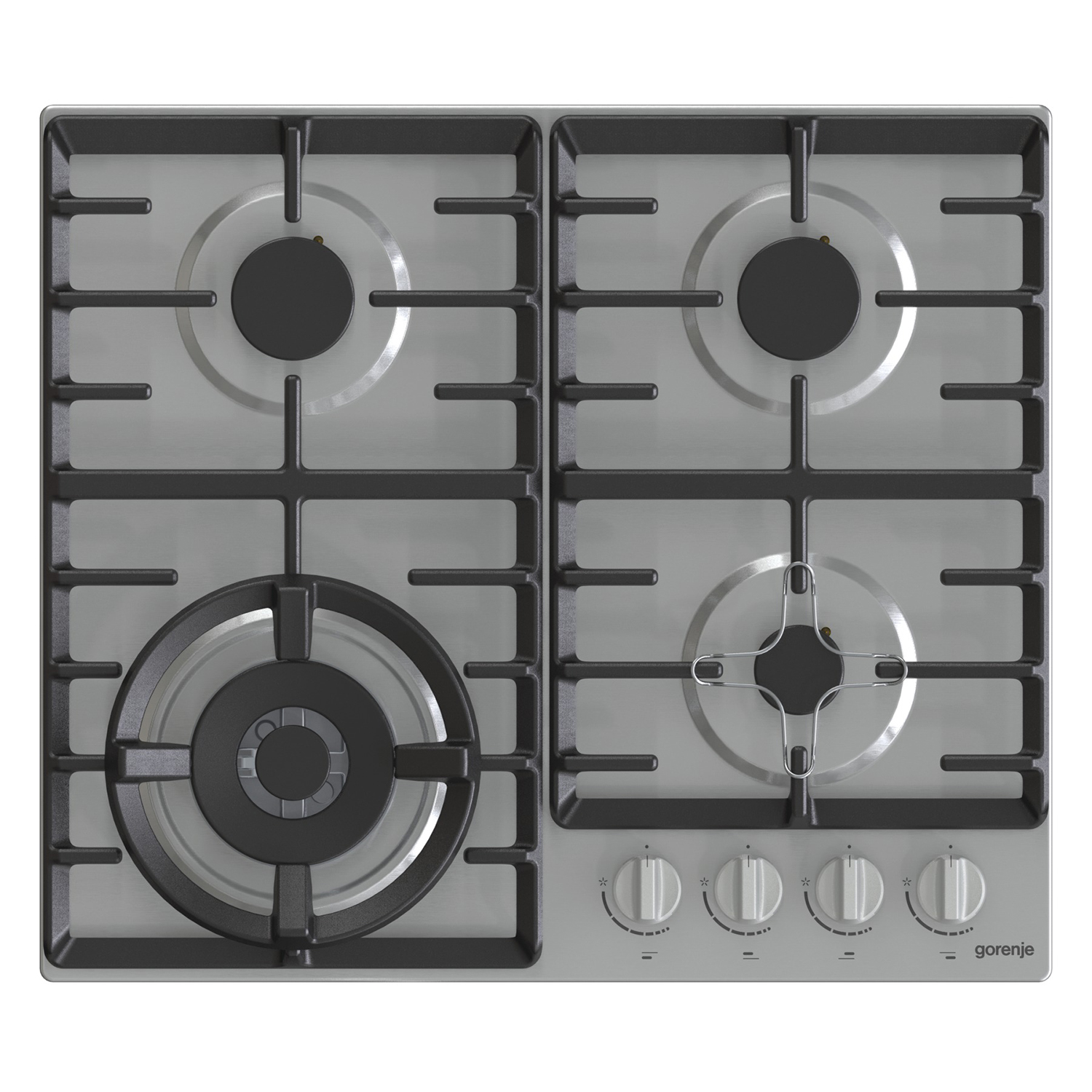 Gas hob, 60 cm, stainless steel, 4 burners, front control, cast iron controls, self ignition, full safety.
